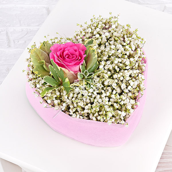 Представленная здесь белоснежная  гипсофила  выглядит легко и невесомо,  словно миллион восторженных фраз, сказанных для любимой. Но главный акцент композиции – прекрасная розовая роза в окружении зелени  питтоспорума! Композиция выглядит потрясающе нежно, привлекательно и мило.