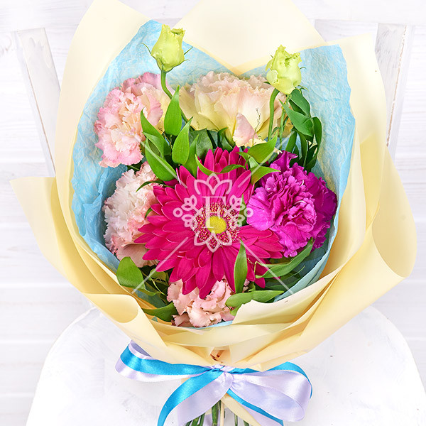 Гербера малиновая – 1 шт., эустома розовая – 1 шт., гвоздика фиолетовая – 1 шт., зелень декоративная, упаковка, лента.